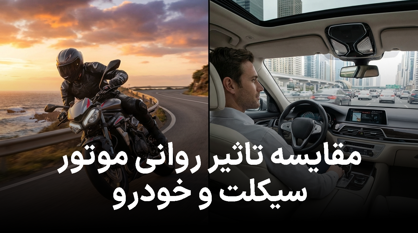 مقایسه روانی رانندگی با موتورسیکلت و خودرو نشان میدهد که هر دو تجربه میتواند با حضور نیروهای مختلف هیجانی و شناختی همراه باشد. موتورسیکلت به طور معمول حس آزادی و حضور فیزیکی شدیدتر را فراهم میکند و میتواند منجر به افزایش آگاهی و تمرکز سریع شود، اما خطرات فیزیکی بیشتری را نیز به همراه دارد که میتواند استرس را افزایش دهد. خودروها به ایجاد احساس امنیت و آرامش بیشتر کمک میکنند و میتواند پشتیبانی از تصمیمگیری کارآمدتر را فراهم آورد، اما ممکن است حس حضور در لحظه را کمرنگتر کند. در نهایت، هر دو حالت رانندگی برای سلامت روانی انسان اثرگذار هستند و بهبود مهارتهای ایمنی، مدیریت استرس و تداوم توجه میتواند تجربه روانی را بهبود بخشد.